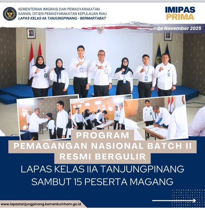 Beritabintan.co.id, Bintan (Kepri)- Lembaga Pemasyarakatan Kelas IIA Tanjungpinang menunjukkan komitmennya dalam mendukung peningkatan kapasitas SDM melalui penyelenggaraan Kegiatan Magang Batch II yang merupakan program hasil inisiatif dari Kementerian Ketenagakerjaan RI dengan meresmikan kegiatan tersebut, Senin (24/11/2025). Sebanyak 15 peserta magang mengikuti kegiatan ini dengan antusias.