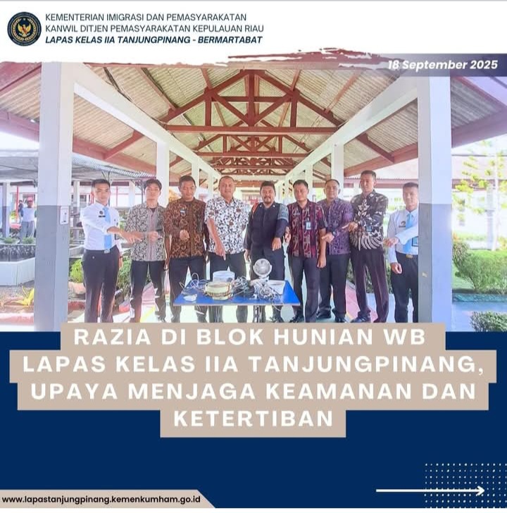Beritabintan.co.id, Bintan (Kepri)-  Lembaga Pemasyarakatan (Lapas) Kelas IIA Tanjungpinang melaksanakan razia gabungan di Blok Hunian WB sebagai langkah tegas menjaga keamanan dan ketertiban. Kegiatan dipimpin langsung oleh Kasubsi Keamanan, dengan melibatkan Staf Kantor dan petugas pengamanan lapas, Kamis (18/09/2025).
