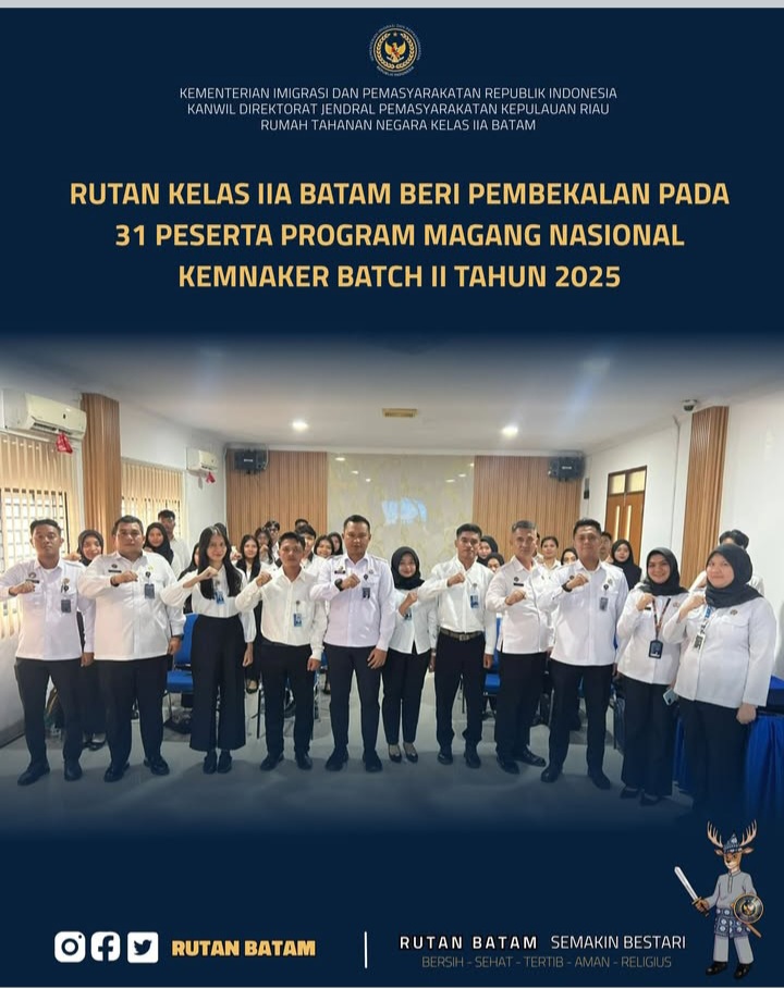 Beritabintan.co.id, Batam (Kepri)- Rumah Tahanan Negara (Rutan) Kelas IIA Batam resmi menerima 31 peserta Program Magang Nasional Batch II Kementerian Ketenagakerjaan (Kemnaker) Tahun 2025. Penerimaan ini diawali dengan kegiatan pembekalan awal sebagai langkah penting untuk membekali para peserta sebelum memasuki lingkungan kerja pemasyarakatan.