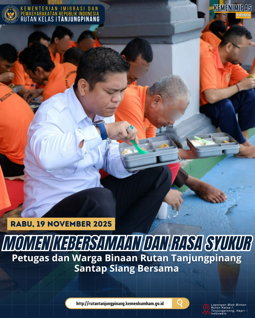 Beritabintan.co.id, Tanjungpinang (Kepri)- Kepala Rutan Kelas I Tanjungpinang, pejabat struktural, dan staf menghadiri kegiatan Tasyakuran Hari Bakti Kementerian Imigrasi dan Pemasyarakatan ke-1 Tahun 2025. Kegiatan ini dilaksanakan pada Rabu, (19/11) pukul 09.00 WIB di Lembaga Pemasyarakatan (Lapas) Kelas IIA Tanjungpinang.