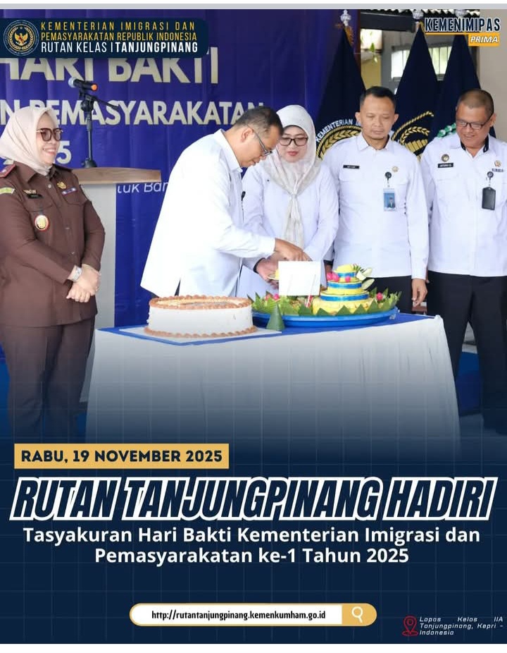 Beritabintan.co.id, Tanjungpinang (Kepri)- Kepala Rutan Kelas I Tanjungpinang, pejabat struktural, dan staf menghadiri kegiatan Tasyakuran Hari Bakti Kementerian Imigrasi dan Pemasyarakatan ke-1 Tahun 2025. Kegiatan ini dilaksanakan pada Rabu, (19/11) pukul 09.00 WIB di Lembaga Pemasyarakatan (Lapas) Kelas IIA Tanjungpinang.