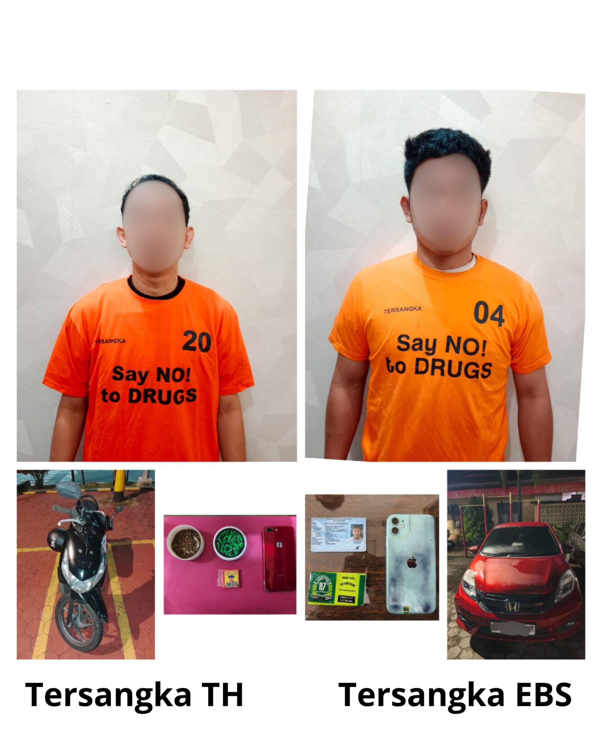 Kemudian tim Sat Resnarkoba bergerak memburu tersangka EBS, dan berhasil di amankan di Kp. Nusantara, Kec. Tanjungpinang Timur pada pukul 11.00 wib, dari tersangka EBS hanya di sita 1 bungkus papir merk Delapan Tujuh dan 1 buah handphone, dari pengakuan tersangka EBS dia mendapatkan narkoba jenis ganja dari WL (DPO) warga Kota Batam.