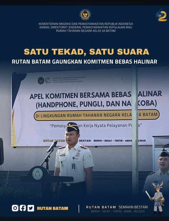 Beritabintan.co.id, Batam (Kepri)- Dalam upaya memperkuat integritas serta menciptakan lingkungan pemasyarakatan yang bersih dan bebas dari pelanggaran, Rumah Tahanan Negara Kelas IIA Batam menggelar Apel Komitmen Bersama Bebas HALINAR (Handphone, Pungli, dan Narkoba) yang dilaksanakan di Lapangan Serbaguna Rutan Kelas IIA Batam.