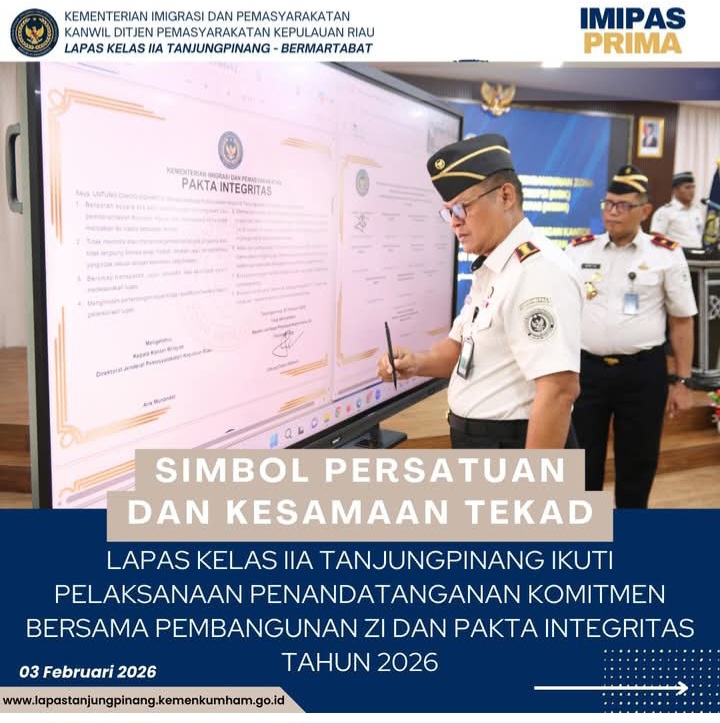 Beritabintan.co.id, Tanjungpinang (Kepri)-Lembaga Pemasyarakatan (Lapas) Kelas IIA Tanjungpinang mengikuti pelaksanaan Penandatanganan Komitmen Bersama dan Pakta Integritas dalam rangka Pencanangan Zona Integritas Menuju Wilayah Bebas dari Korupsi (WBK) dan Wilayah Birokrasi Bersih dan Melayani (WBBM) Tahun 2026, di lingkungan Kanwil Direktorat Jenderal Pemasyarakatan Kepulauan Riau, Selasa (03/02/2026).