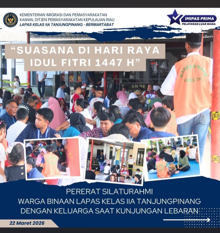 Beritabintan.co.id, Bintan (Kepri)-  Dalam rangka memperingati Hari Raya Idulfitri 1447 H serta mempererat tali silaturahmi antara warga binaan dengan keluarga, Lembaga Pemasyarakatan (Lapas) Kelas IIA Tanjungpinang membuka layanan kunjungan khusus Lebaran yang dimulai pada hari pertama Idul Fitri hingga hari ke tiga nanti, Minggu (22/03/2026).