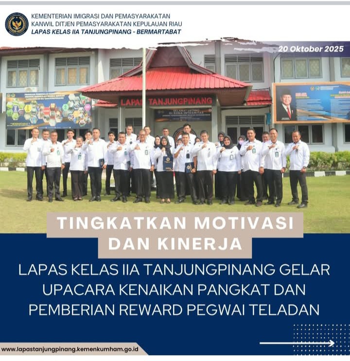 Beritabintan.co.id, Bintan (Kepri)-  Lembaga Pemasyarakatan Kelas IIA Tanjungpinang melaksanakan Apel Senin Pagi disejalankan dengan kegiatan penyematan tanda kenaikan pangkat dan pemberian reward pegawai teladan sepanjangn Tahun 2025, Senin (20/10/2025). Kegiatan ini menjadi momentum penting sebagai bentuk penghargaan atas dedikasi dan integritas para pegawai dalam menjalankan tugas.