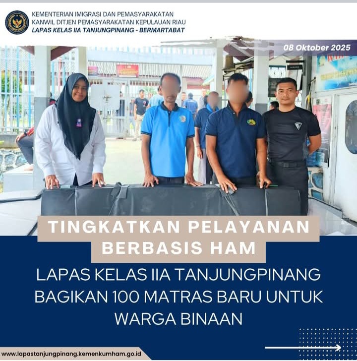 Beritabintan.co.id, Bintan (Kepri)-  Dalam rangka meningkatkan pelayanan berbasis HAM, Lembaga Pemasyarakatan Kelas IIA Tanjungpinang mendistribusikan 100 pcs matras (alas tidur) kepada Warga Binaannya, yang dilakukan dengan pendataan terlebih dahulu agar pendistribusian tepat sasaran, karena akan dilakukan secara bertahap sesuai dengan sarana yang tersedia, Rabu (08/10/2025).