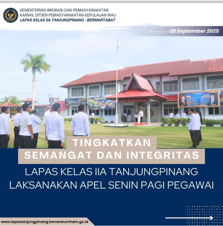 Beritabintan.co.id, Bintan (Kepri)- Mengawali hari kerja dengan menggelar rutinitas apel senin pagi pegawai di Lembaga Pemasyarakatan Kelas IIA Tanjungpinang. Apel di gelar di halaman Lapas Kelas IIA Tanjungpinang yang dipimpin langsung Kepala Lembaga Pemasyarakatan (Kalapas) Kelas IIA Tanjungpinang, Untung Cahyo Sidharto. Apel pagi diikuti oleh seluruh Pejabat Struktural, JFT dan JFU, Senin (29/09/2025).