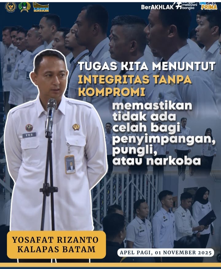 Beritabintan.co.id, Batam (Kepri)- Kalapas Batam pada apel pagi ini mengingatkan kepada seluruh petugas Lapas Batam bahwa tugas kita menuntut integritas tanpa kompromi dan memastikan tidak ada celah bagi penyimpangan, pungli dan narkoba. (Maman)