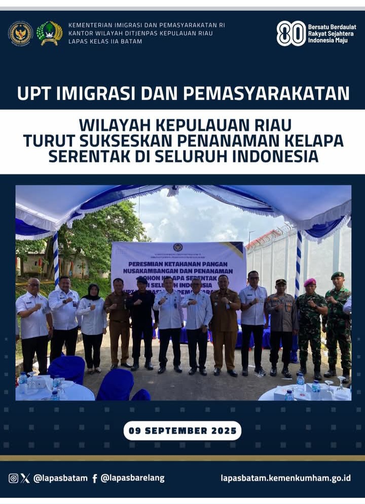 Beritabintan.co.id, Batam (Kepri)- Dalam upaya mendukung program nasional ketahanan pangan yang menjadi salah satu agenda prioritas pemerintahan Presiden Republik Indonesia, Prabowo Subianto, seluruh Unit Pelaksana Teknis (UPT) Imigrasi dan Pemasyarakatan di Indonesia, termasuk di wilayah Kepulauan Riau, secara serentak melaksanakan kegiatan Peresmian Ketahanan Pangan Nusakambangan dan Penanaman Pohon Kelapa Serentak, pada Selasa, 9 September 2025.