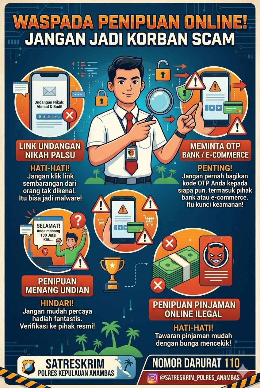 Beritabintan.co.id, Anambas (Kepri)- Maraknya berbagai modus penipuan online, mulai dari pinjaman online (pinjol) ilegal hingga penipuan berkedok hadiah, menjadi perhatian serius Polres Kepulauan Anambas.