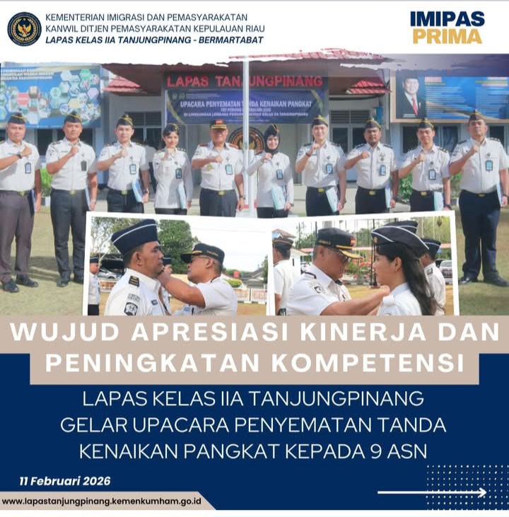 Beritabintan.co.id, Bintan (Kepri)- Lembaga Pemasyarakatan (Lapas) Kelas IIA Tanjungpinang menggelar Upacara Penyematan Tanda Kenaikan Pangkat bertempat di Halaman Lapas Kelas IIA Tanjungpinang, Rabu (11/02/20206). Kegiatan berlangsung khidmat dan penuh rasa bangga sebagai bentuk penghargaan atas dedikasi serta peningkatan kompetensi pegawai.
