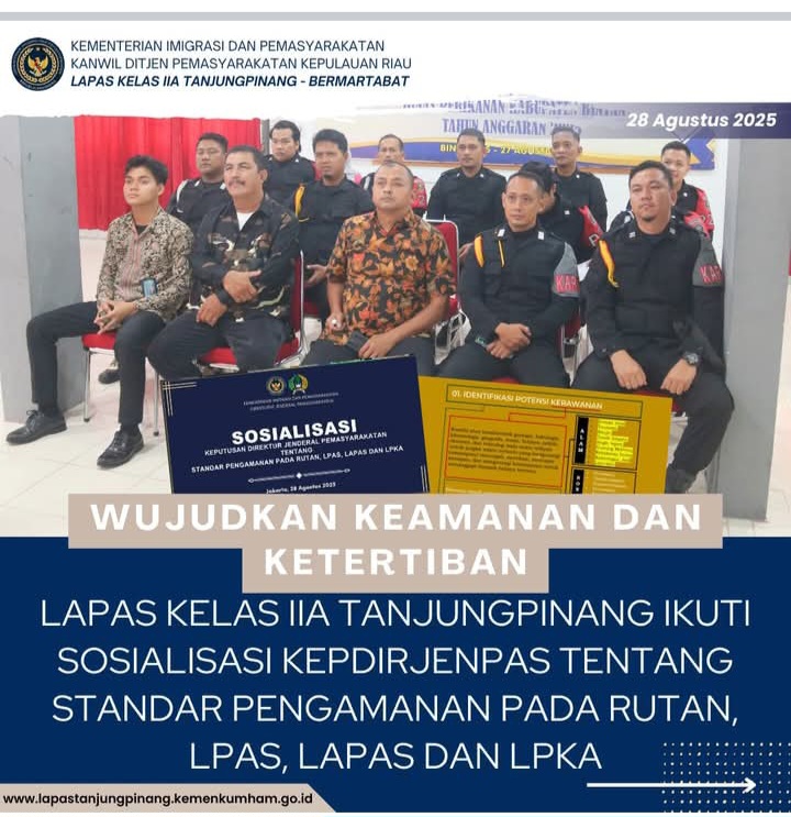 Beritabintan.co.id, Bintan (Kepri)- Lembaga Pemasyarakatan Kelas IIA Tanjungpinang mengikuti kegiatan sosialisasi terkait Keputusan Direktorat Jenderal Pemasyarakatan (Ditjenpas) mengenai Standar Pencegahan, Penindakan dan Pemulihan Gangguan Keamanan dan Ketertiban Pada Rumah Tahanan Negara (Rutan), Lembaga Penempatan Anak Sementara (LPAS), Lembaga Pemasyarakatan (Lapas) dan Lembaga Pembinaan Khusus Anak (LPKA), Kamis (28/08/2025).